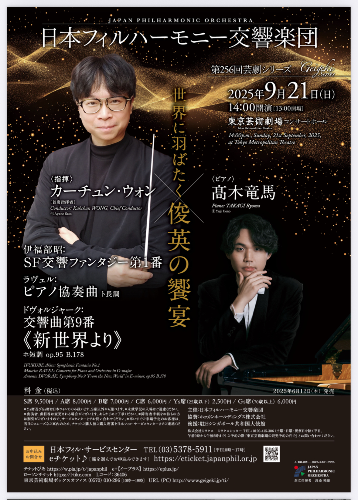 日本フィル第256回芸劇シリーズ コンサート 2025.09.212025.09.30 日本フィル第256回芸劇シリーズを聴いてきました。 いわゆる名曲プロにしてもちょっと不思議な取り合わせだなと思っていたのですが、コンサートを聴いて納得! 「ドシラ」のモチーフ繋がりとは!笑 カーチュンさんに導かれた日フィルは、今日も各曲を鮮やかに。《新世界》のアングレはこれまで聴いたなかでも出色の絶品ソロでした! いつもお世話になっている福生市立第二中学校の小玉公二先生に期せずしてお会いしました。私のすぐ2列後ろの座席でした!